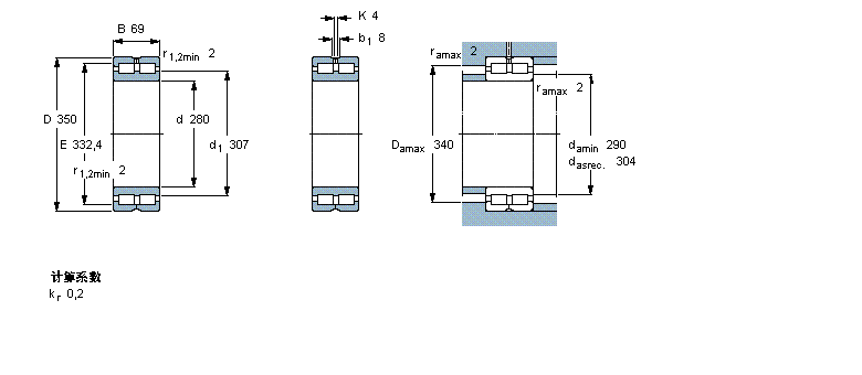 | 圓柱滾子軸承, 雙列滿裝滾子, 無密封件, 雙方向軸向負荷的擋邊 | ||||||||||